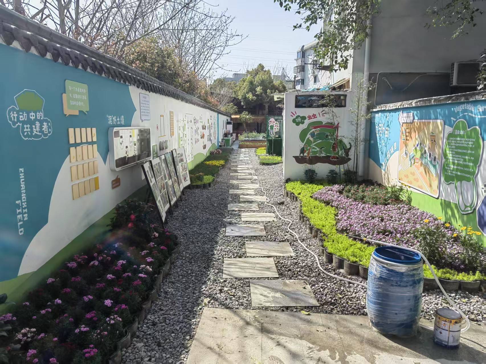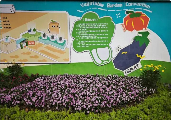 园内划分出十几片“一米农田”及果树区,种植20多种蔬菜和水果,每种植物都配有专属信息标识牌;道路重新硬化并修建步道,铺排浇灌用水设备,新安装的门头趣味十足,一侧墙面布置农耕知识展板。项目注重“软环境”打造,邀请辖区中小学学生、社区孩子开展“沉浸式”种植体验课,由经验丰富的老农和学校名师授课,通过茶话会、绘画课等形式“话”说农种事、“画”说农种美,让孩子们体验劳动快乐、感悟食物来之不易,养成节约低碳的生活习惯。