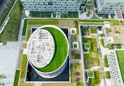 资源循环与可再生能源应用并行:依托2套雨水回收系统用于园区绿化灌溉与景观补水,利用屋顶空间铺设2584㎡太阳能光伏板发电及供应热水,显著提升绿色能源在总能耗中的占比。