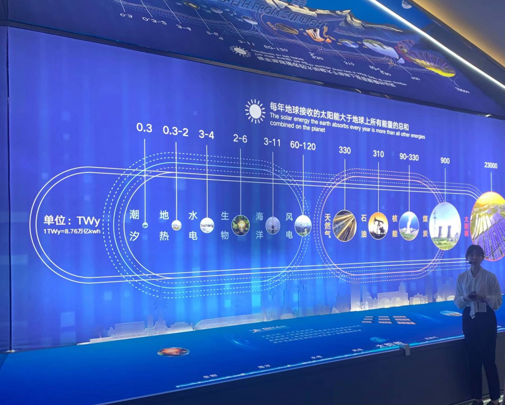 在隆基绿能展览馆里,有一个特殊的电子展板,上面分别列出了地球上各种能源所能提供的能量,包括潮汐、地热、水电、生物、石油、煤炭等。而根据数据显示,每年地球接收的太阳能大于地球上所有能量的总和。